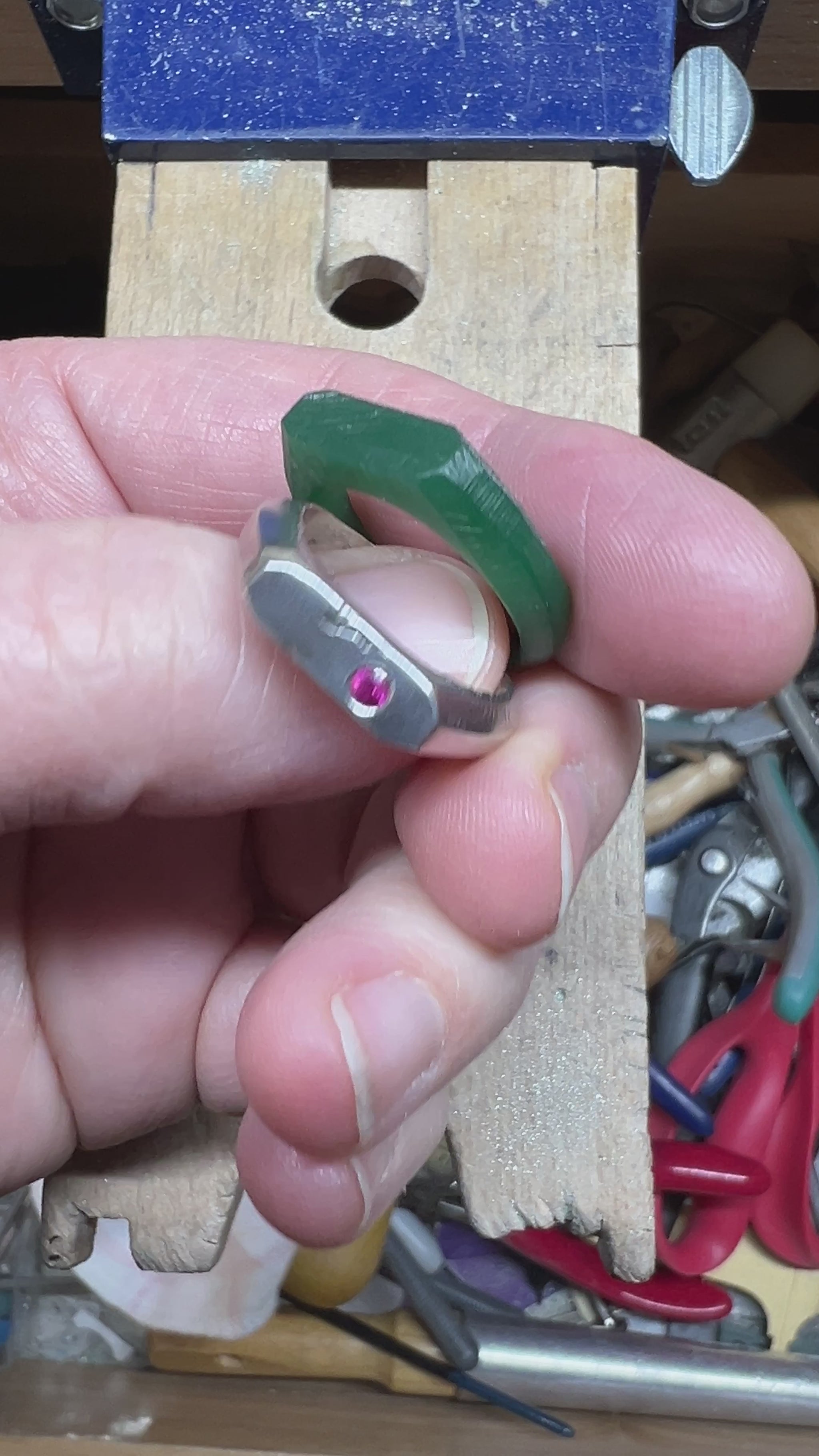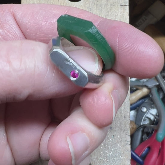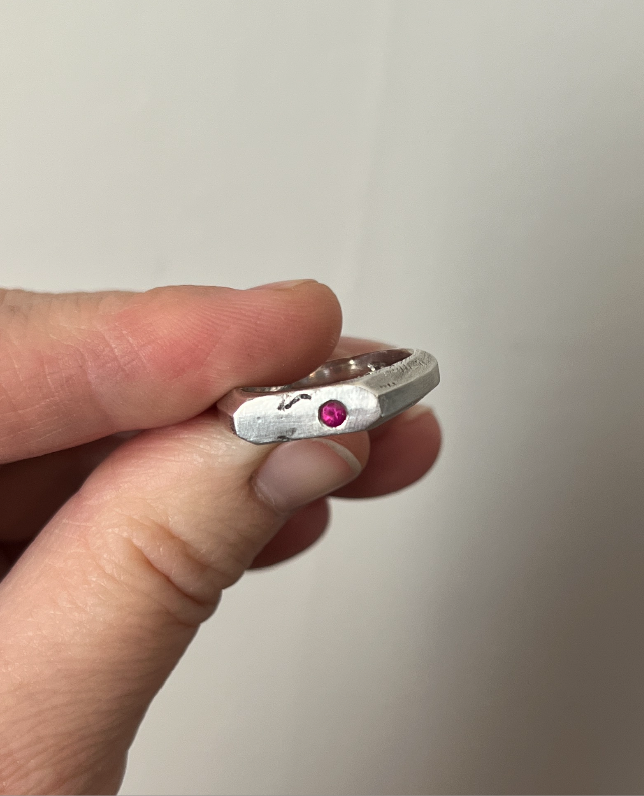 For millennia rubies have symbolized passion, protection, and wealth. This slim but powerful signet ring was sandcast in solid sterling with a flush set natural ruby. I'm also here for the brutalist finish of it!
